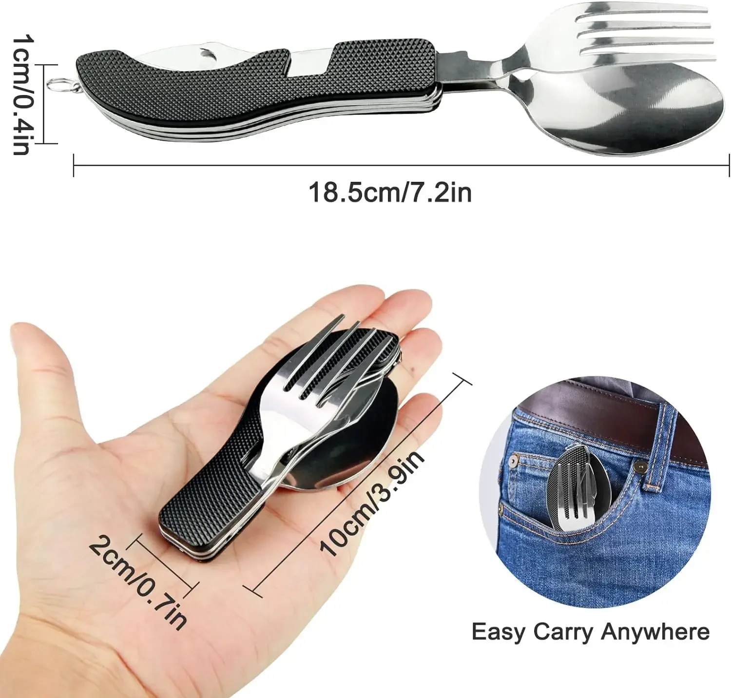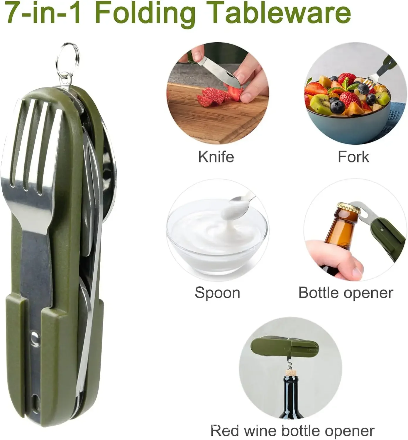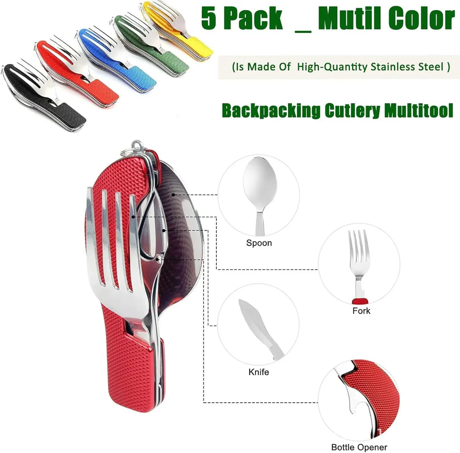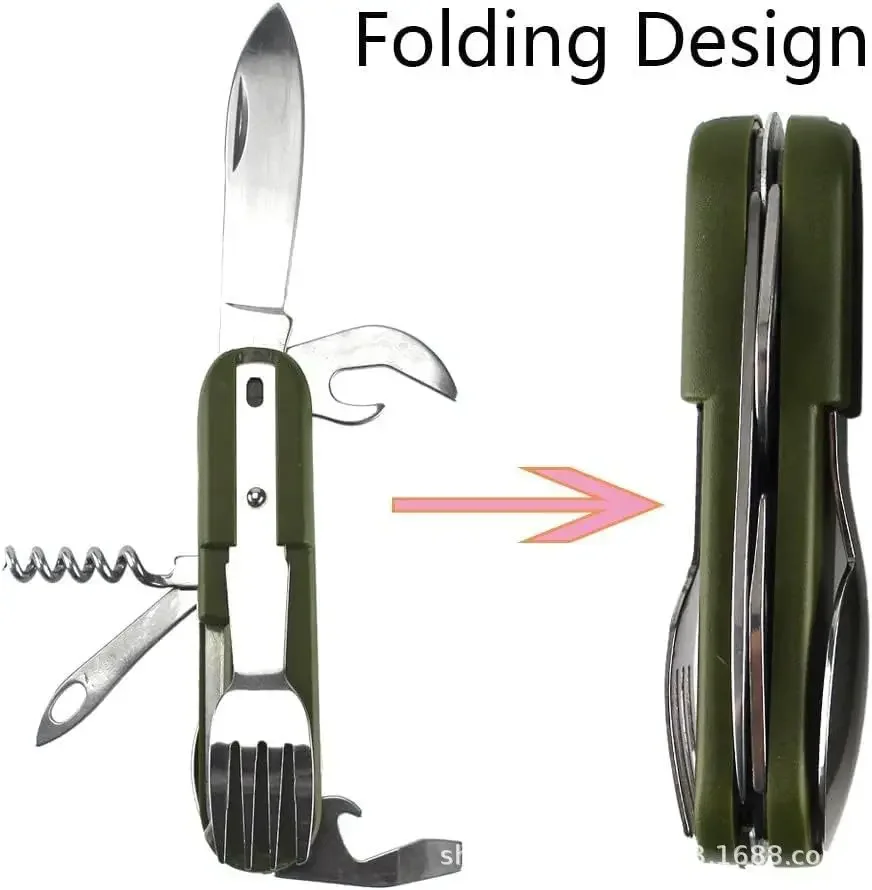 A compact 7-in-1 camping utensil tool designed for lightweight outdoor eating and travel. Combines multiple utensils into one portable tool for camping, hiking, and emergency kits.